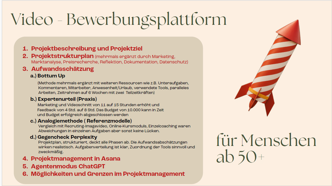 Eine Video Bewerbungsplattform für Menschen ab 50+ wurde im Projektmanagement mit Asana strukturiert und geplant. Hier findest du das PDF zu meinem Projekt.