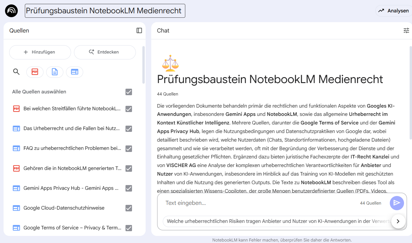 Eine Audiozusammenfassung in NotebookLM im Bereich Medienrecht. Geschützte Inhalte und dem Umgang mit aufgearbeiteten Daten mit KI. Hier findest du das PDF zu meinem Projekt.
